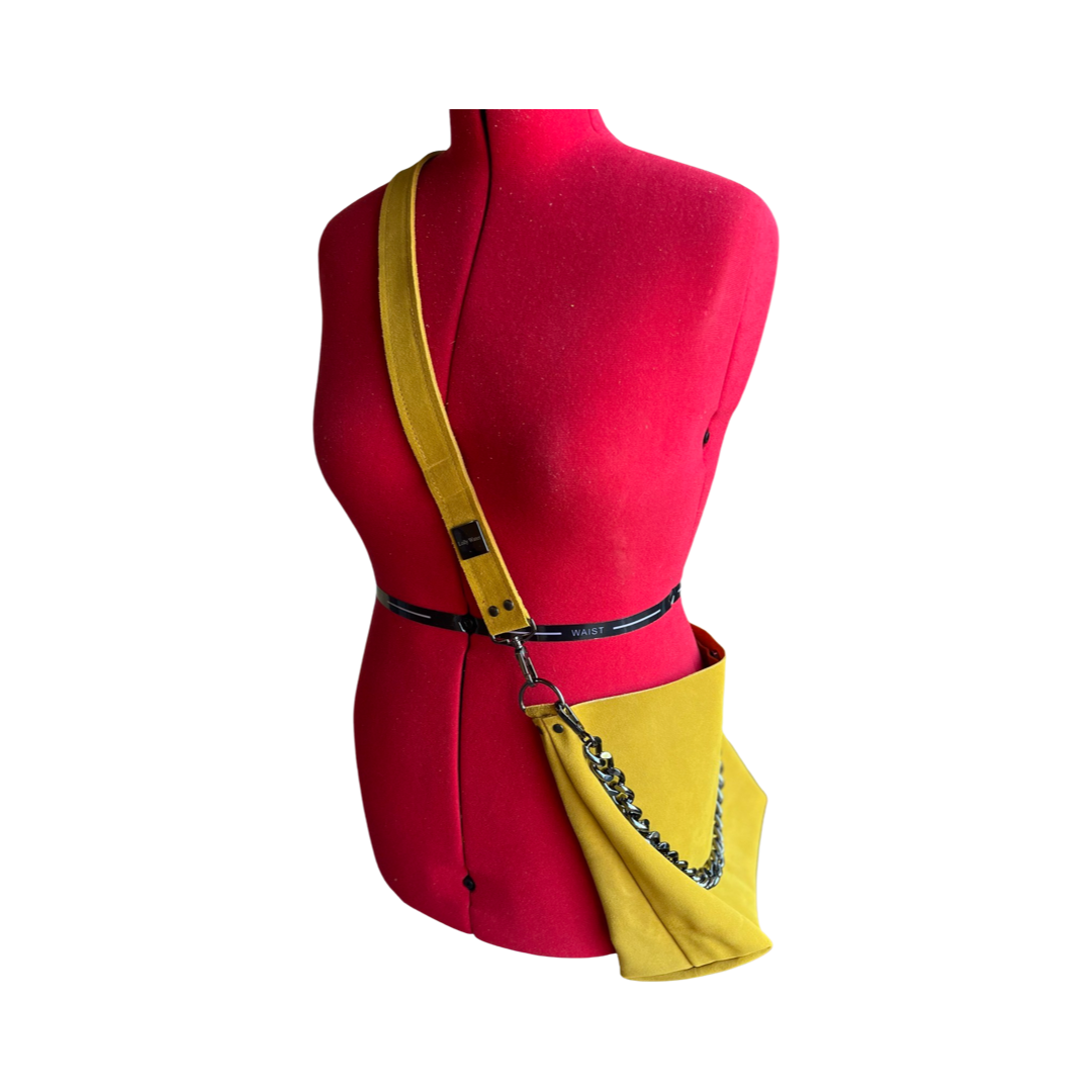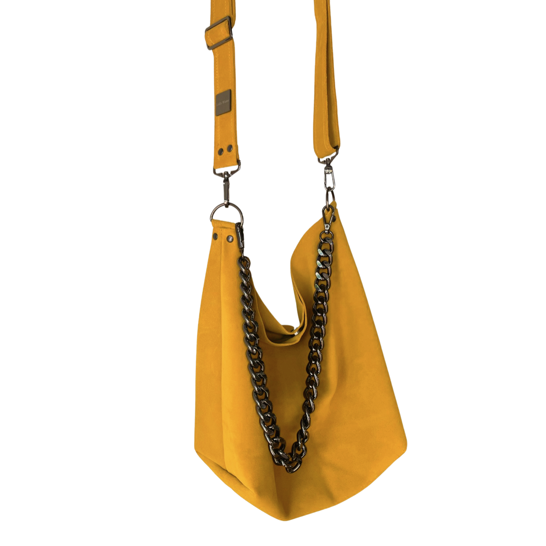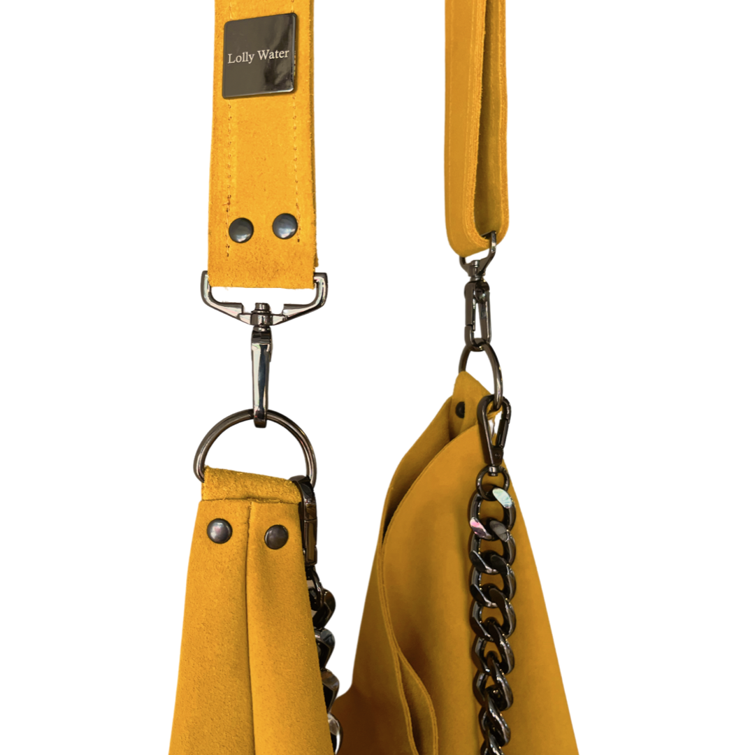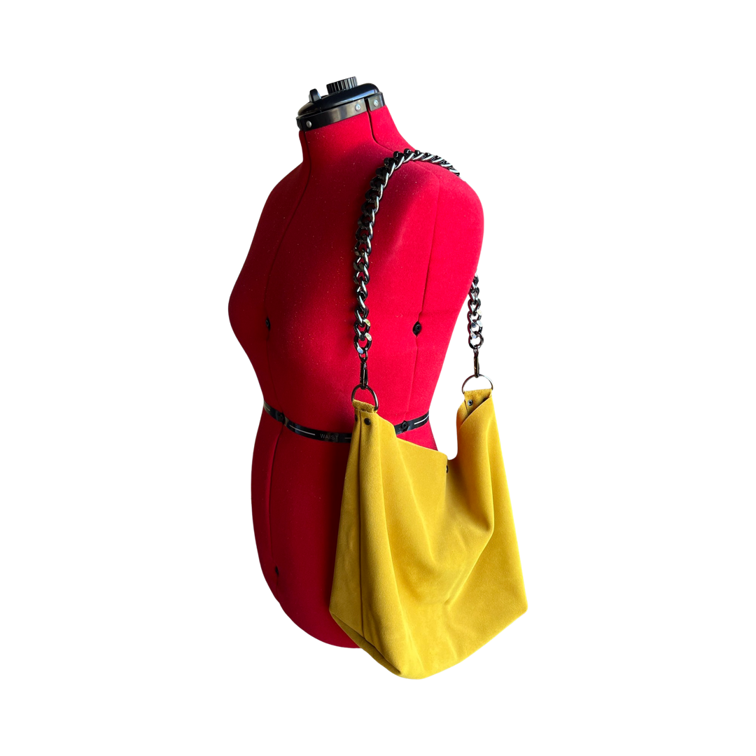 Boho meets Luxury!  Add a splash of color to any look with this high quality leather purse. This premium suede leather has a luxurious look and feel paired with high quality gun-metal black hardware. Strap is adjustable to fit your personal style. Over the shoulder or crossbody. Chain can be used decoratively adding extra sparkle or as an alternative shoulder strap for a more refined look. Big enough to carry everything you need for the day but not big enough to be cumbersome. Handmade with love in San Diego, CA.